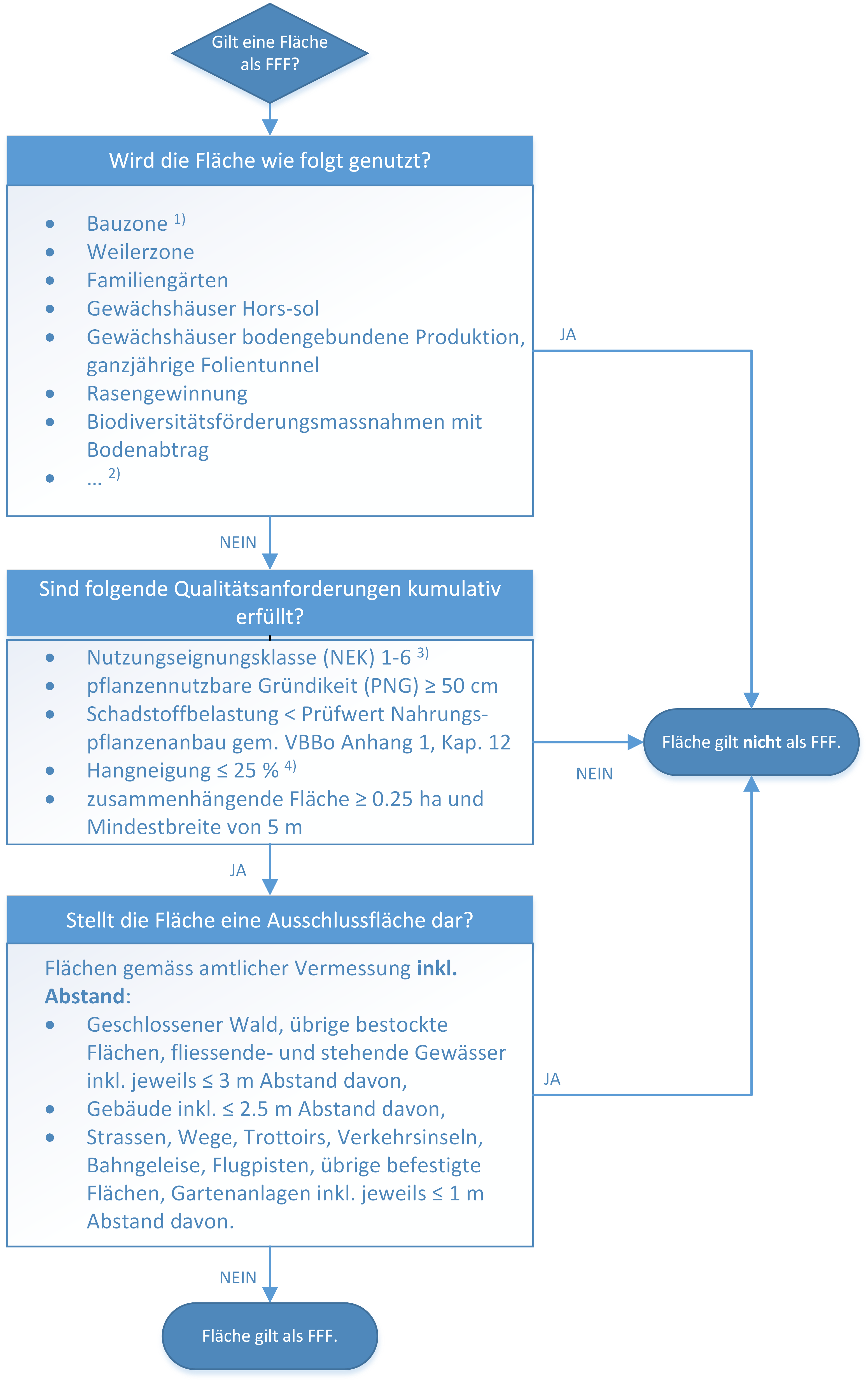 2) Die Liste ist nicht abschliessend. Als Faustregel gilt, dass Böden, auf welchen die FFF-Qualität langfristig gesichert ist und auf denen im Falle einer schweren Mangellage innerhalb eines Jahres wieder ein ortsüblicher Ertrag möglich ist, anrechenbar sind. Weitere Hinweise sind im Erläuterungsbericht zum Sachplan FFF 2020 (S. 26/27) zu finden.